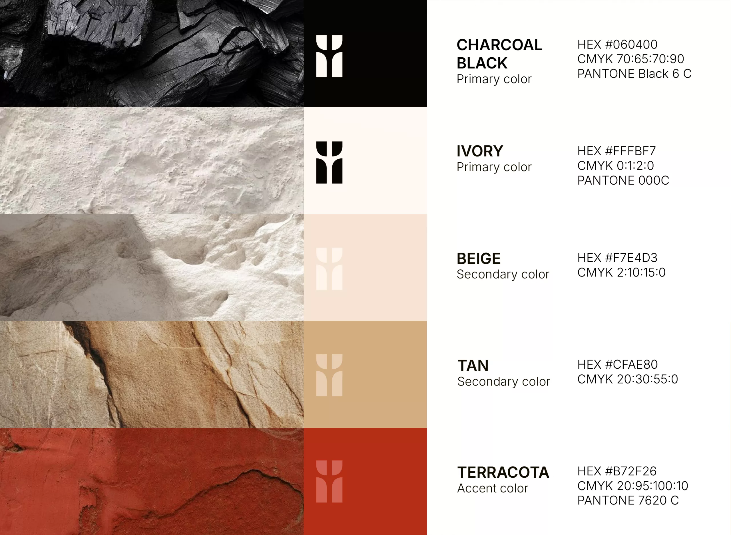 The identity includes a logo in four variations for different layouts, colors of natural resources such as coal, chalk, and red jasper. Thus, the palette emphasizes the naturalness of the products. For the same reason, kraft paper and unprocessed cardboard were chosen as the basis for packaging materials. Therefore, the identity elements were developed taking into account the need for Pantone printing.